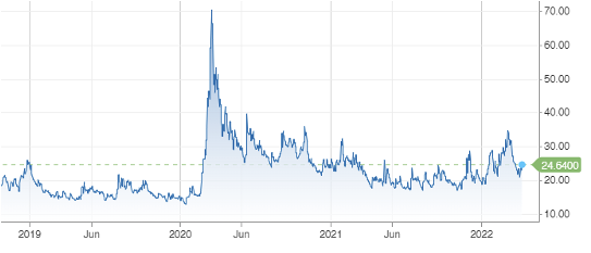 Figure 1: VIX (CBOE Volatility) Index, 2019-2022. Source: CNBC